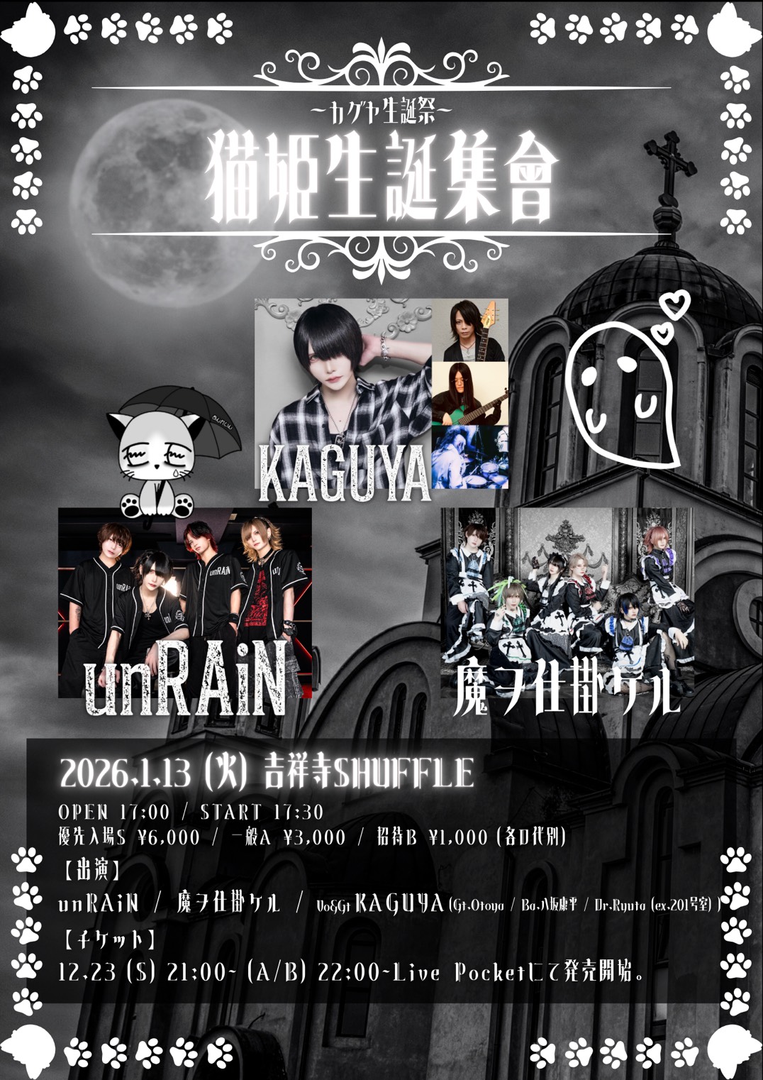 【 カグヤ生誕祭【猫姫生誕集會】 】 【日程】 2026年1月13日(火) OPEN 17:00 / START 17:30 【会場】 吉祥寺SHUFFLE 東京都武蔵野市吉祥寺南町2丁目6-10 フジパームビルB1F 【出演】 unRAiN / KAGUYA (Gt.Otoya / Ba.八坂康平 / Dr.Ryuta(ex.201号室)) / 魔ヲ仕掛ケル 【チケット】 優先入場S \6,000 / 一般A \3,000 / 招待B \1,000(各D代別) S→Live pocket 12/23 21:00~ A、B→ Live pocket 12/23 22:00~ ※購入URLは @HK_OFFICIAL0114 にて1分前公開。 ※Sチケットのみ発売開始から10分間スマホ、クレカのみ。